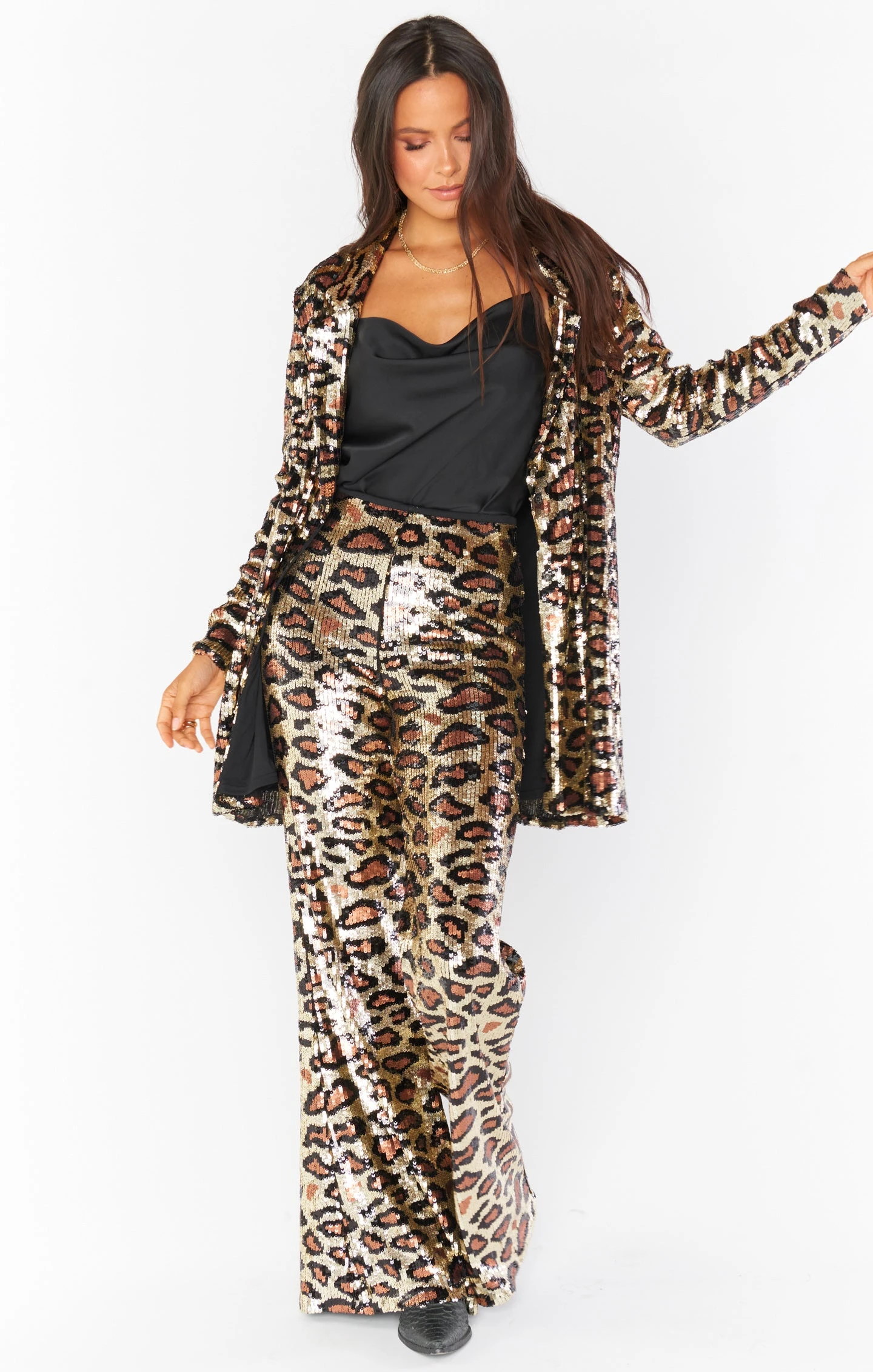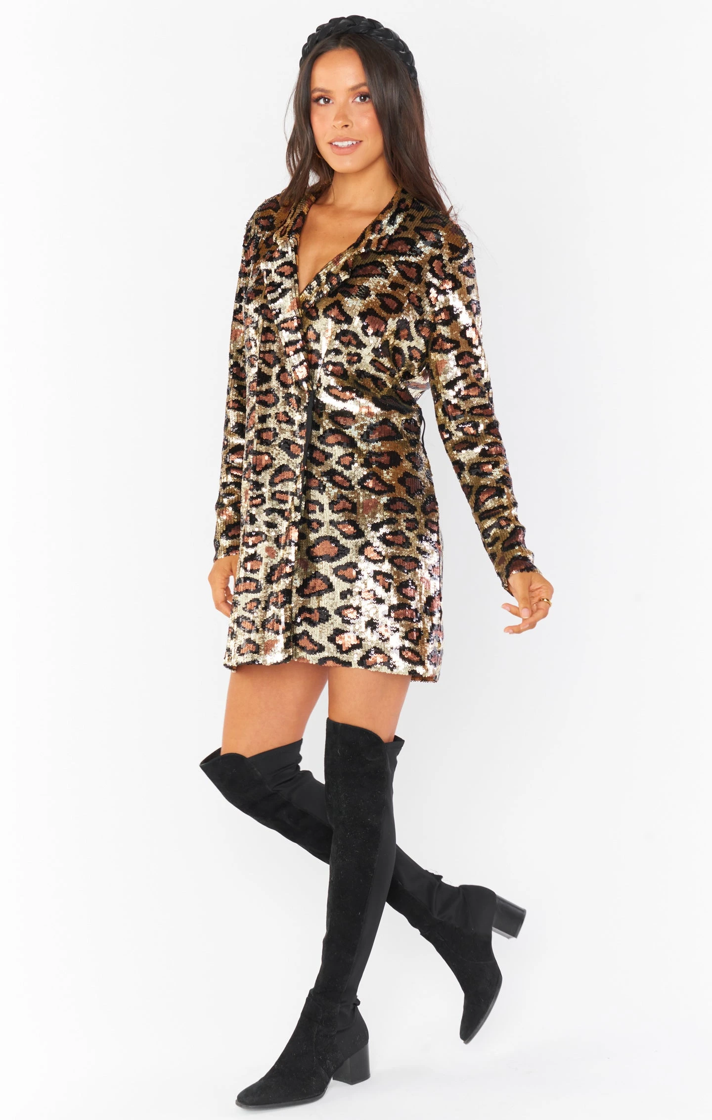 This cheetah blazer dress has sequins all over, a v-cut neckline, and a hidden button closure to perfect the fit. Transform this dress into a sequined blazer and wear it open with the Amabella bodysuit and skinnies, or wear is closed as a dress to create the perfect party look.
