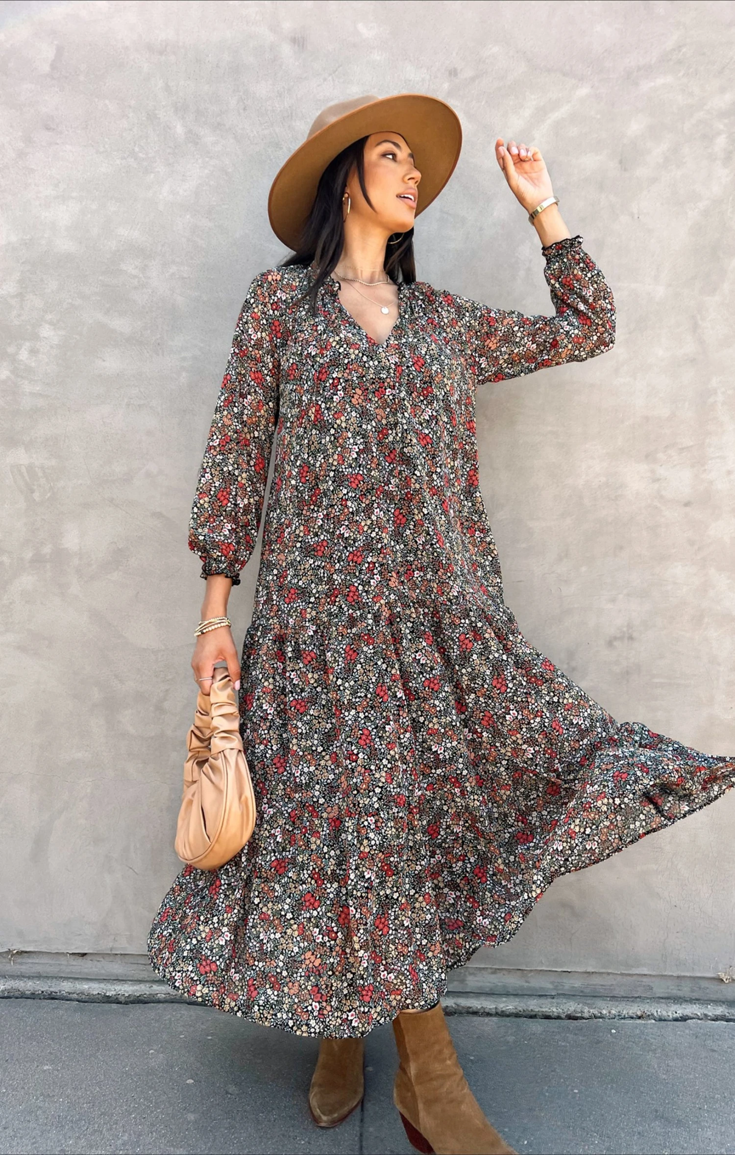 A little Birdie told me that this is the new go-to floral tiered maxi! High on the shoulders with an open v-neck with ties give this a super relaxed vibe while still looking chic. Easily thrown on for a day of errands or can be dressed up for a nice evening or brunch!
