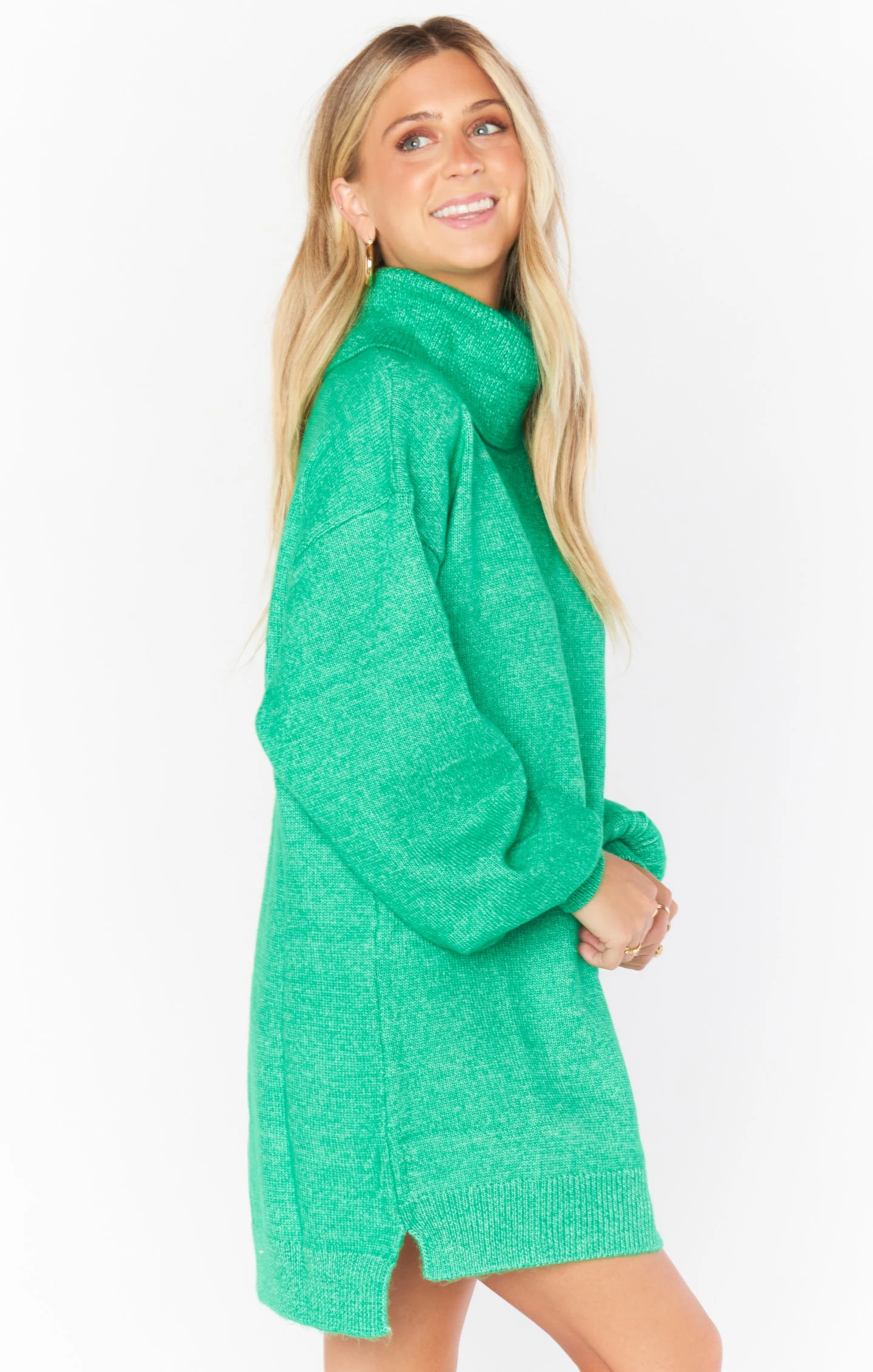 This kelly green sweater dress has mastered the comfy-chic look! She’s a turtle neck dress with perfect balloon sleeves, this knit mini is an effortless closet must-have!