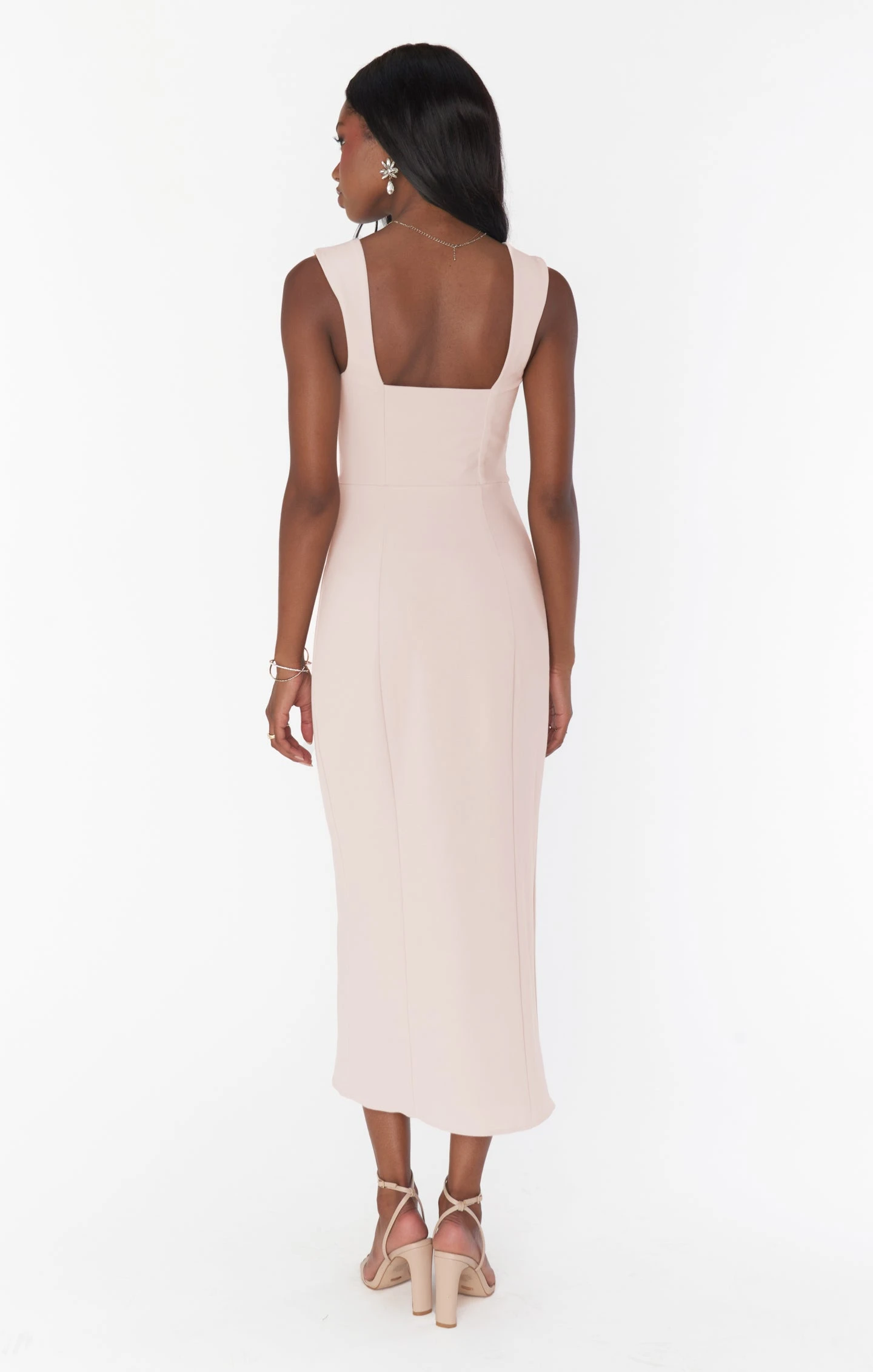 This fitted midi dress is as flattering as it is comfortable. Dusty blush stretchy fabric holds in all the right places, punctuated with a side slit. The square neck is complemented with a thicker strap to ensure you feel secure no matter where you wear her!
