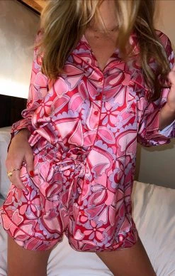 Love’s in the air with our favorite pj set! You’ll want to wake up every morning in this silky soft outfit! We paired drawstring waist shorts with a long sleeve button up blouse in our Candy Hearts print.