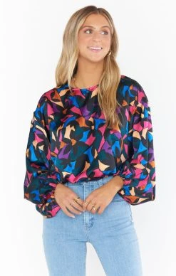 Let the good times roll in this party top of the season! A luxe satin fabric, with a playful mosaic print, escalates this classic silhouette. Pull off the perfect evening look with the Wrap Me Up Skirt and heels, or wear with your fave wide leg denim.