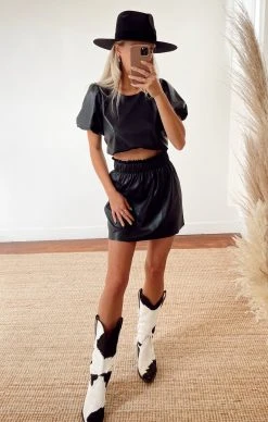 This faux leather black top brings all the cool girl style you could want. A puff sleeve and slightly cropped length makes it perfect to pair with your high waisted denim or go all out with the matching Malone Mini Skirt and boots.