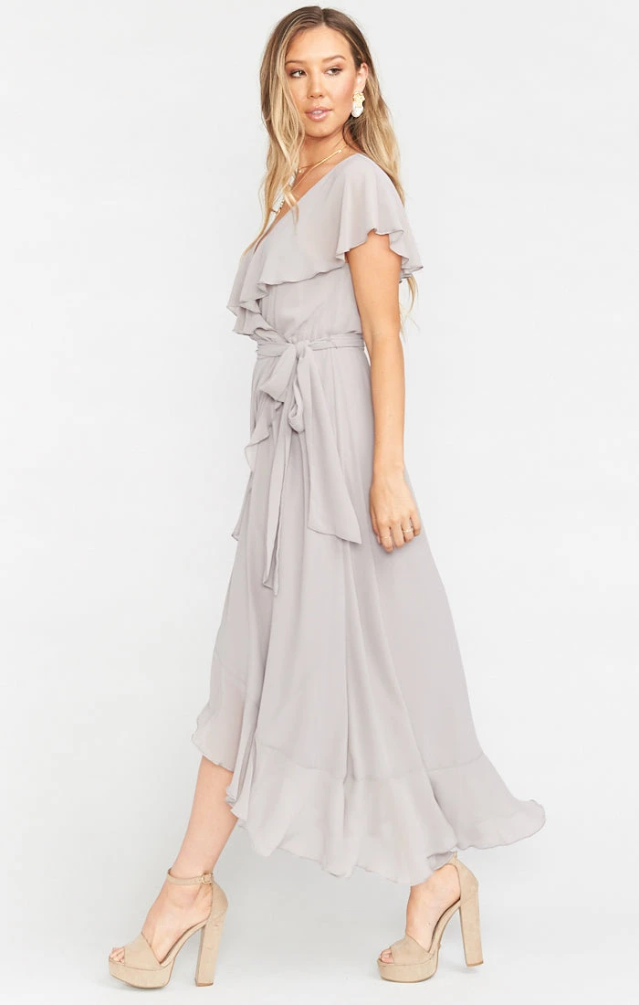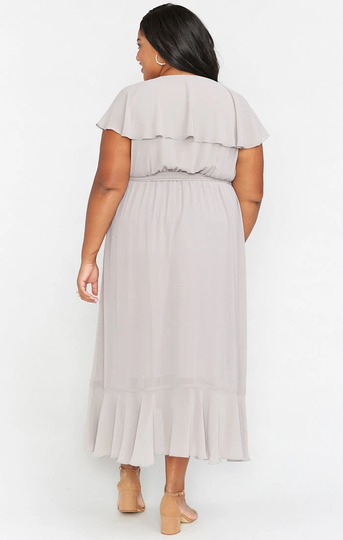 Show Me Your Mumu Jess Ruffle Midi Dress ~ Dove Grey Chiffon
