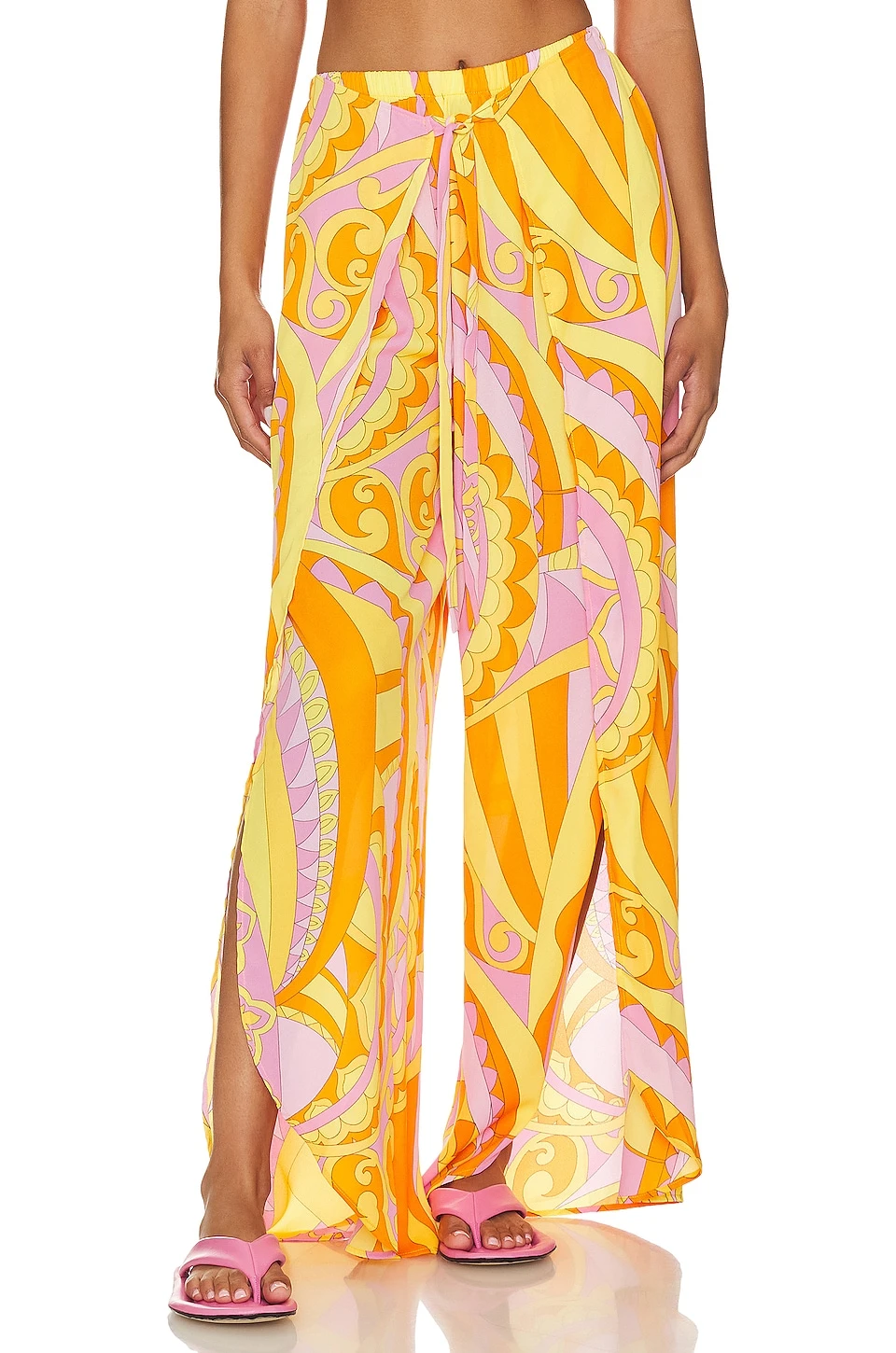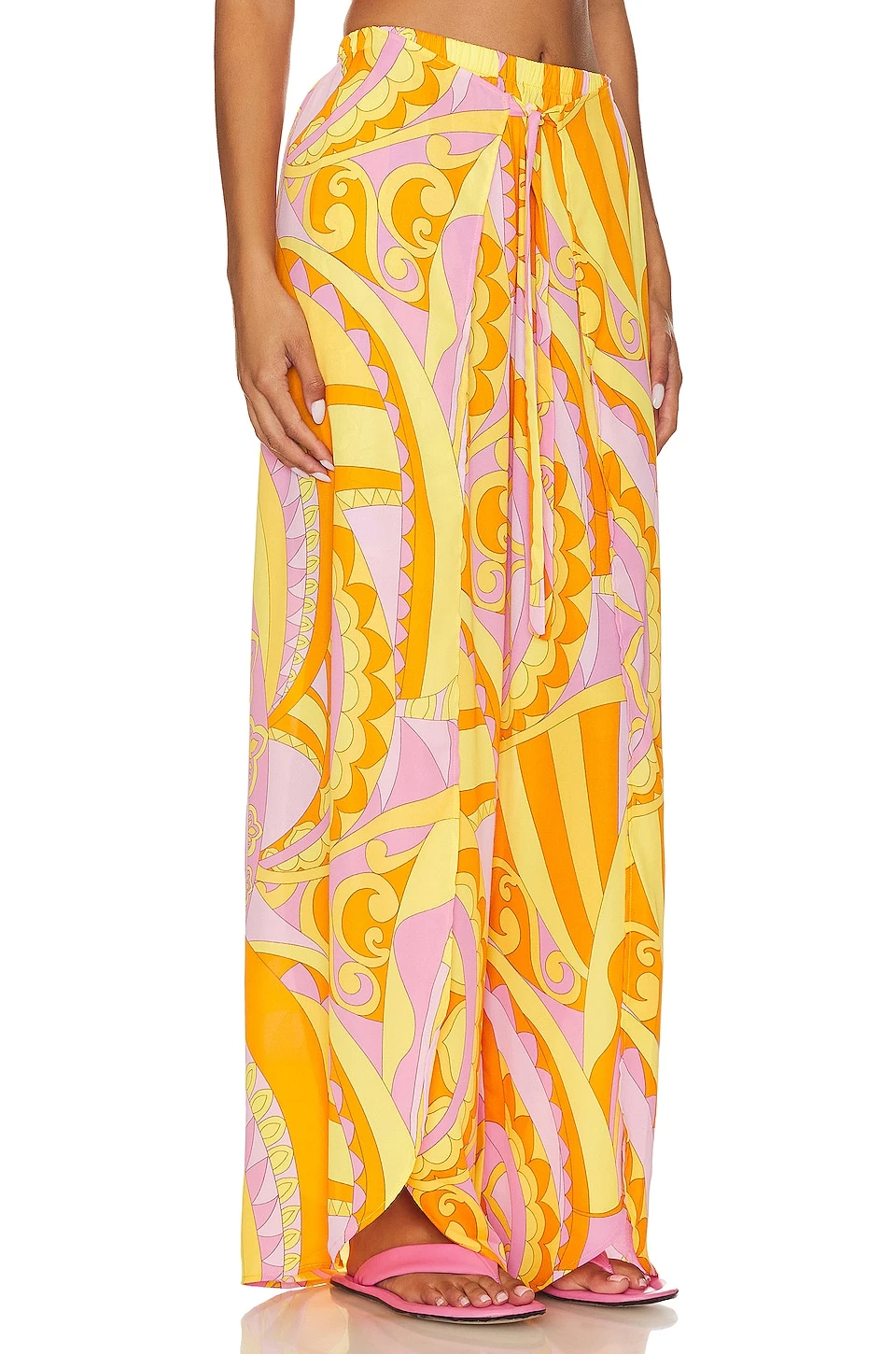 - Elastic waist with attached tie closure at front