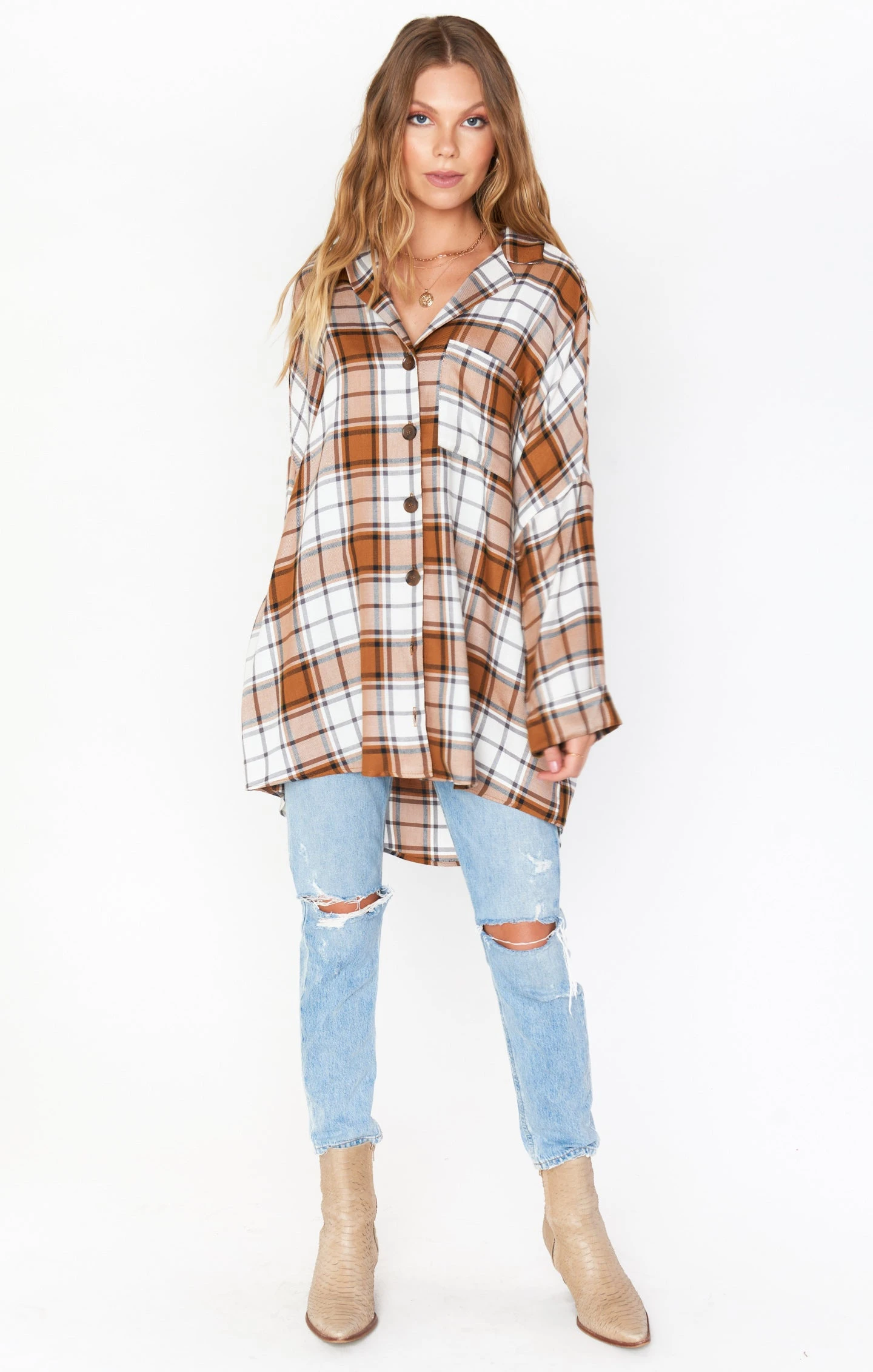 Like your boyfriend’s favorite button-down, but so much better. This tan plaid tunic has an oversized fit and front button closures making it easy to wear open, closed or tied up.