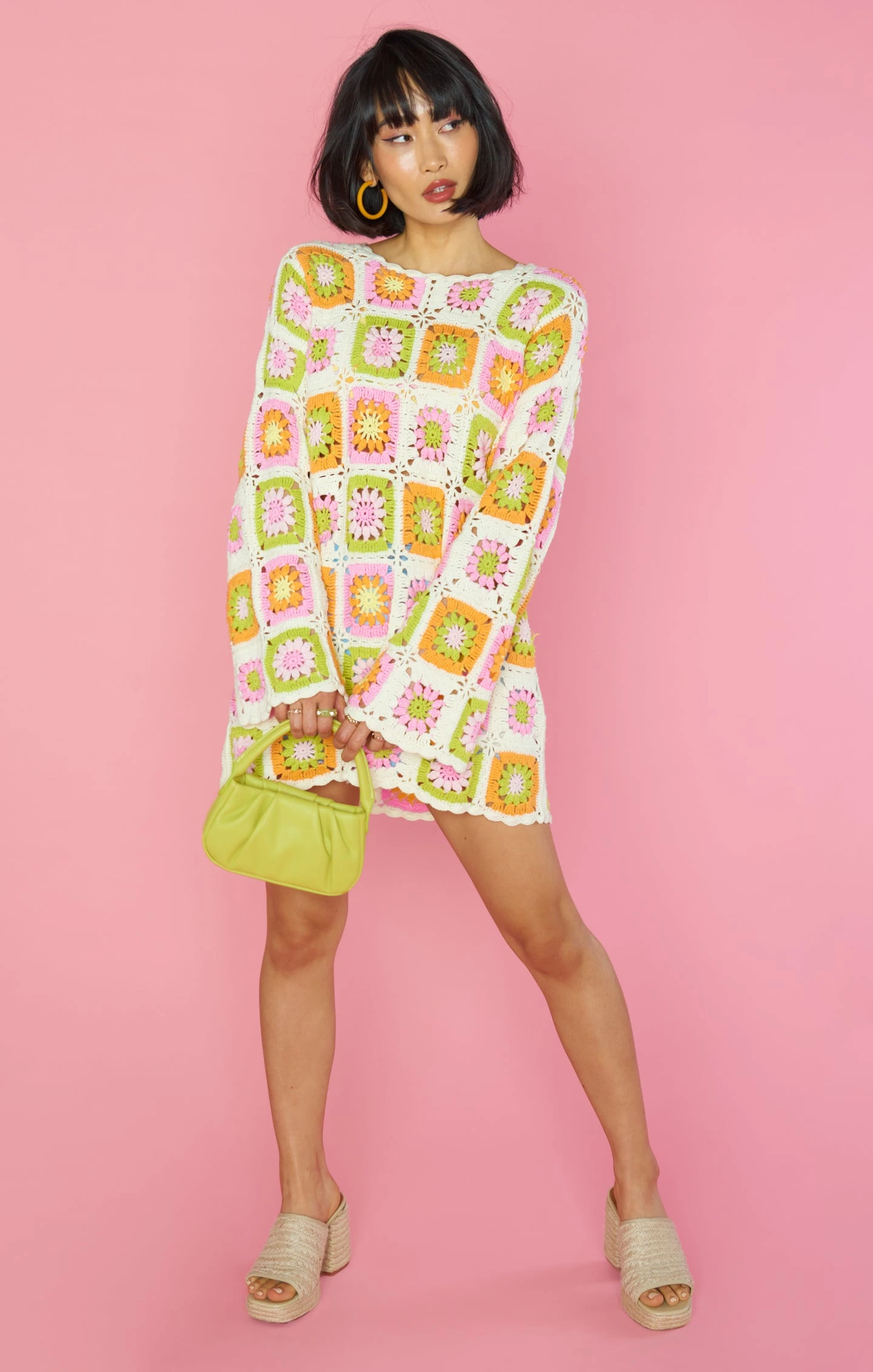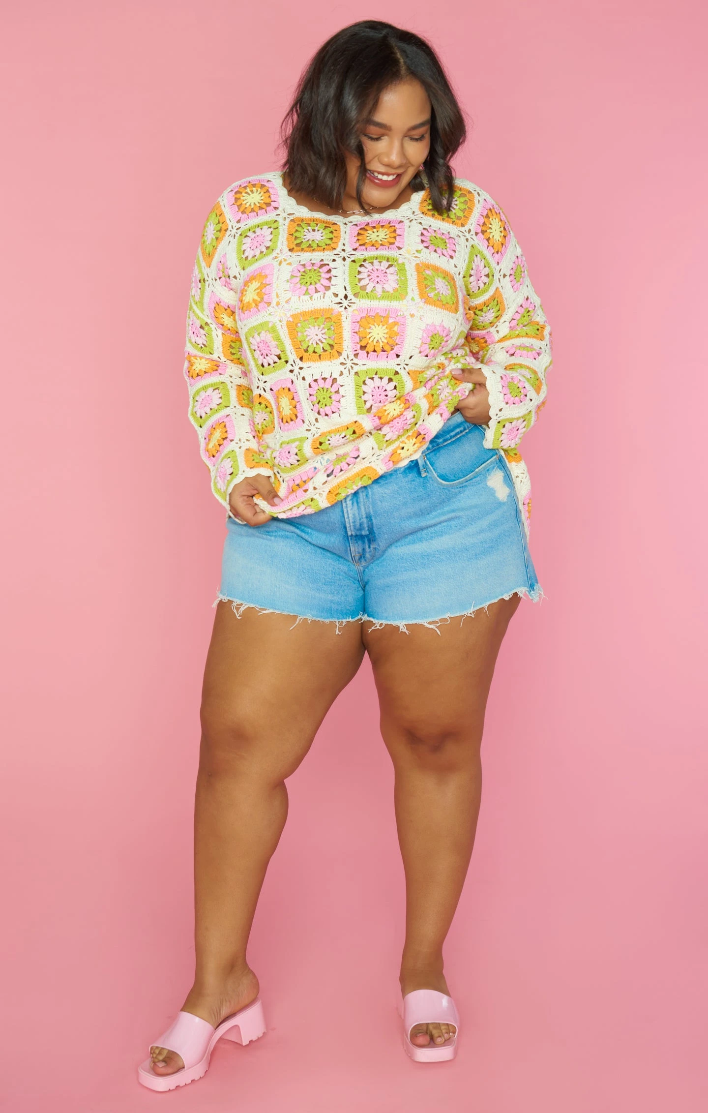 The 60’s are calling and you need to be answering in this multi-colored crochet coverup. Bell sleeves for the boho inspo, and the relaxed fit for beach babe days. This fits like a tunic, so to achieve more length, we suggest sizing up one or two sizes.