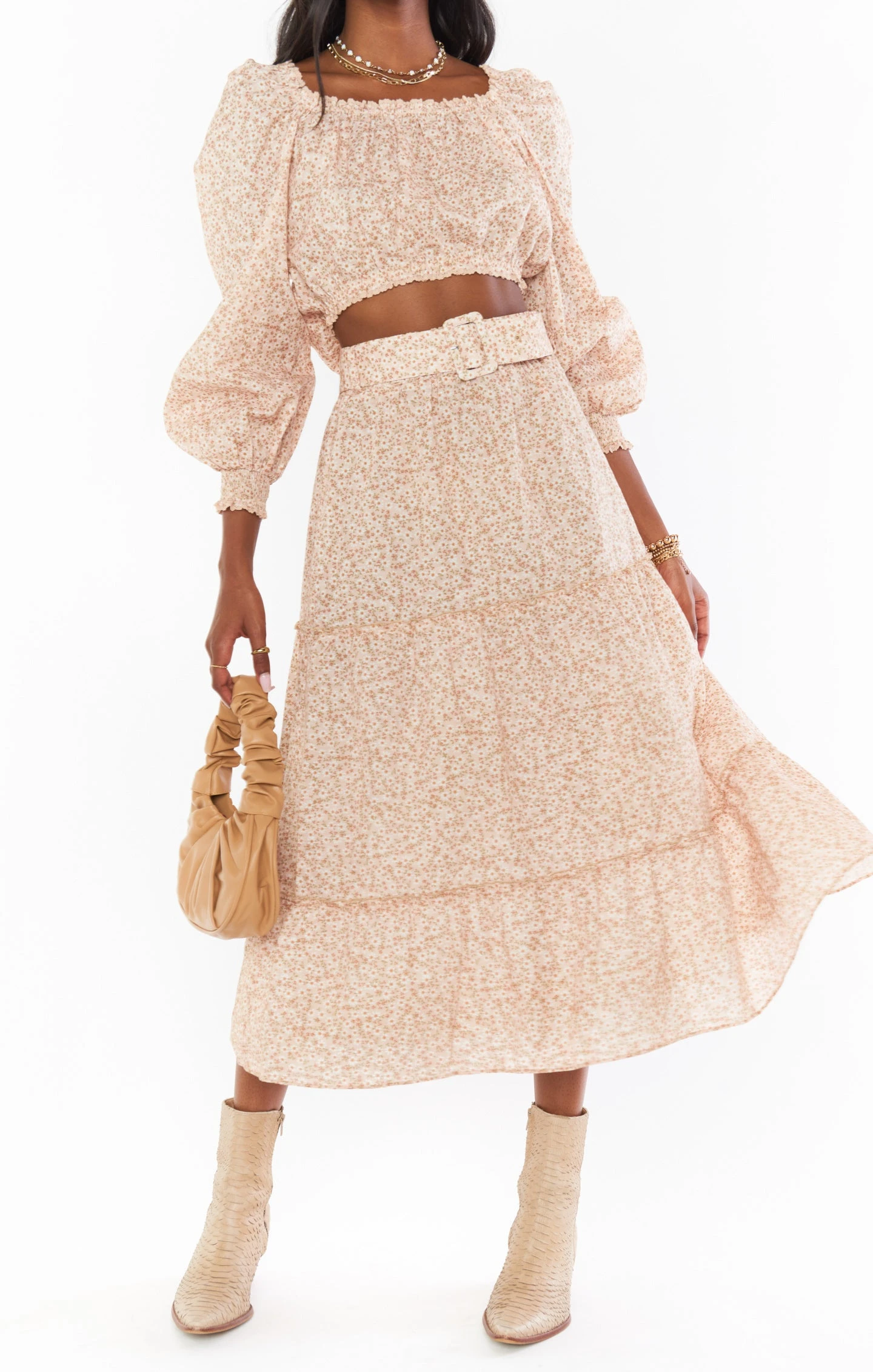 Dress her up, or dress her down, the Miley Midi Skirt is perfect for any occasion. Three tiers of lightweight fabric with a delicate floral print throughout create this flowy silhouette with a ruffled midi hem. A high waist and adjustable matching belt compliment the smallest part of your waist. Add some chunky sandals and a cute top for perfect boho vibes.