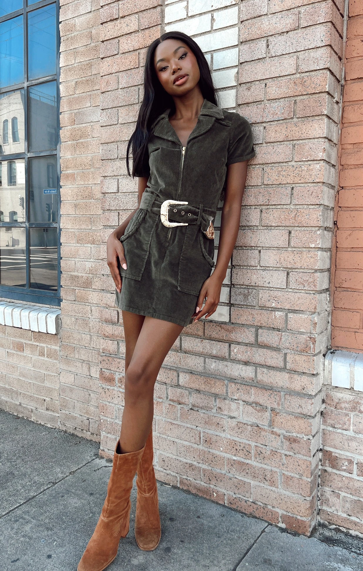 This corduroy mini dress breaks all the rules. She zips all the way down the front so you decide how much of Mu you want to show! She has a fitted waist, big cargo-ish pockets, and is collared at the top. Get ready to strut your stuff in this green Outlaw mini dress!