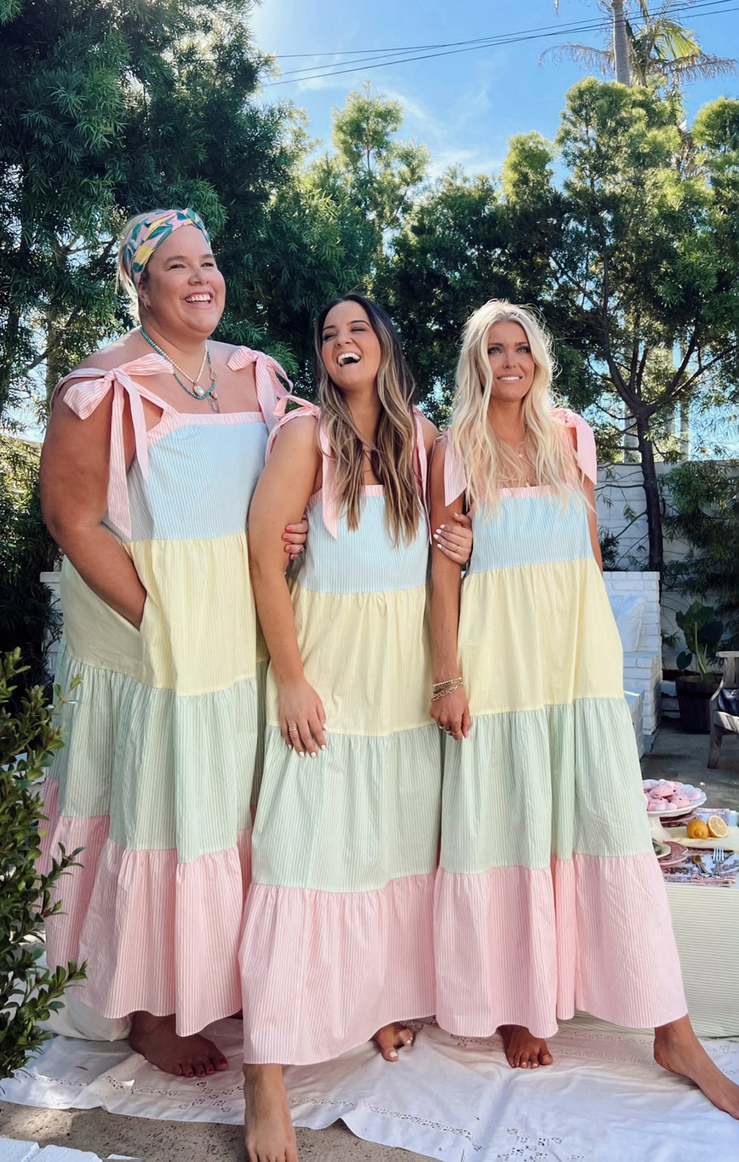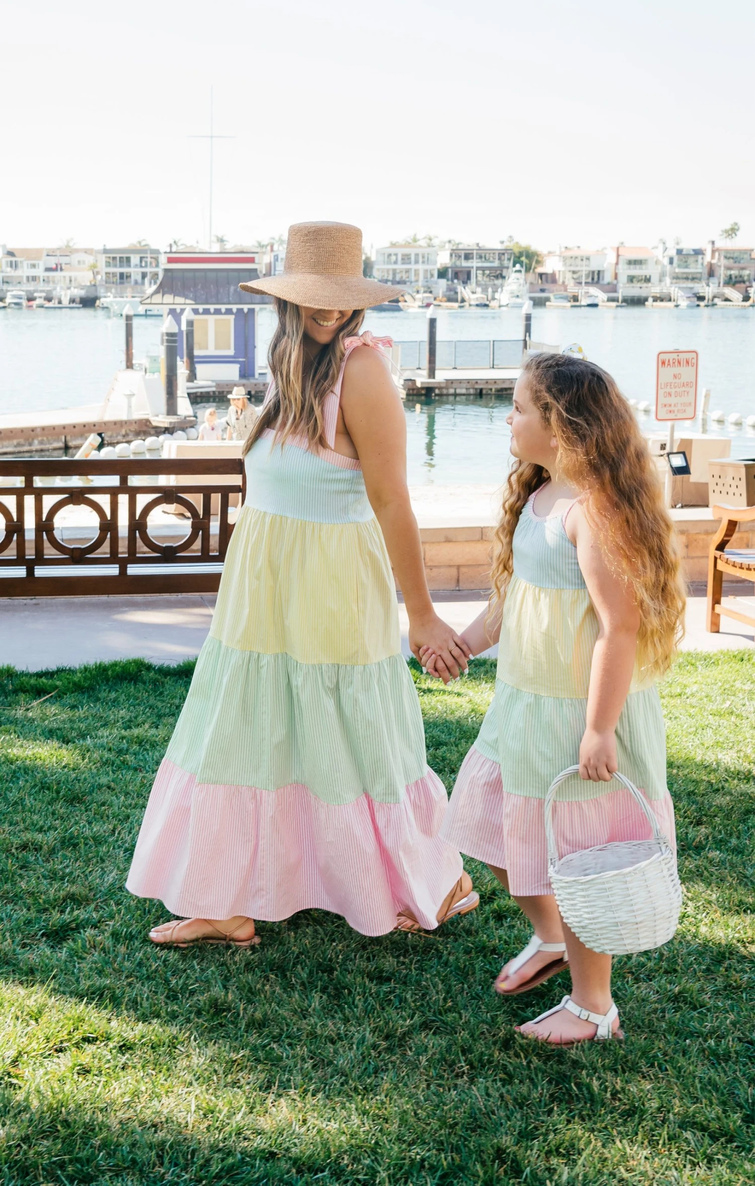 Simple and chic, you will reach for this multi colored maxi dress time and time again! Tiered shearing, flowing body and shelf bra are elevated by bows atop thick spaghetti straps. The rainbow color blocks have us ready for sunshiney spring days! Bonus points for pockets. Wear with sandals for everyday, or dress up with a heel. Match your mini and get them the Little Sabrina Dress.