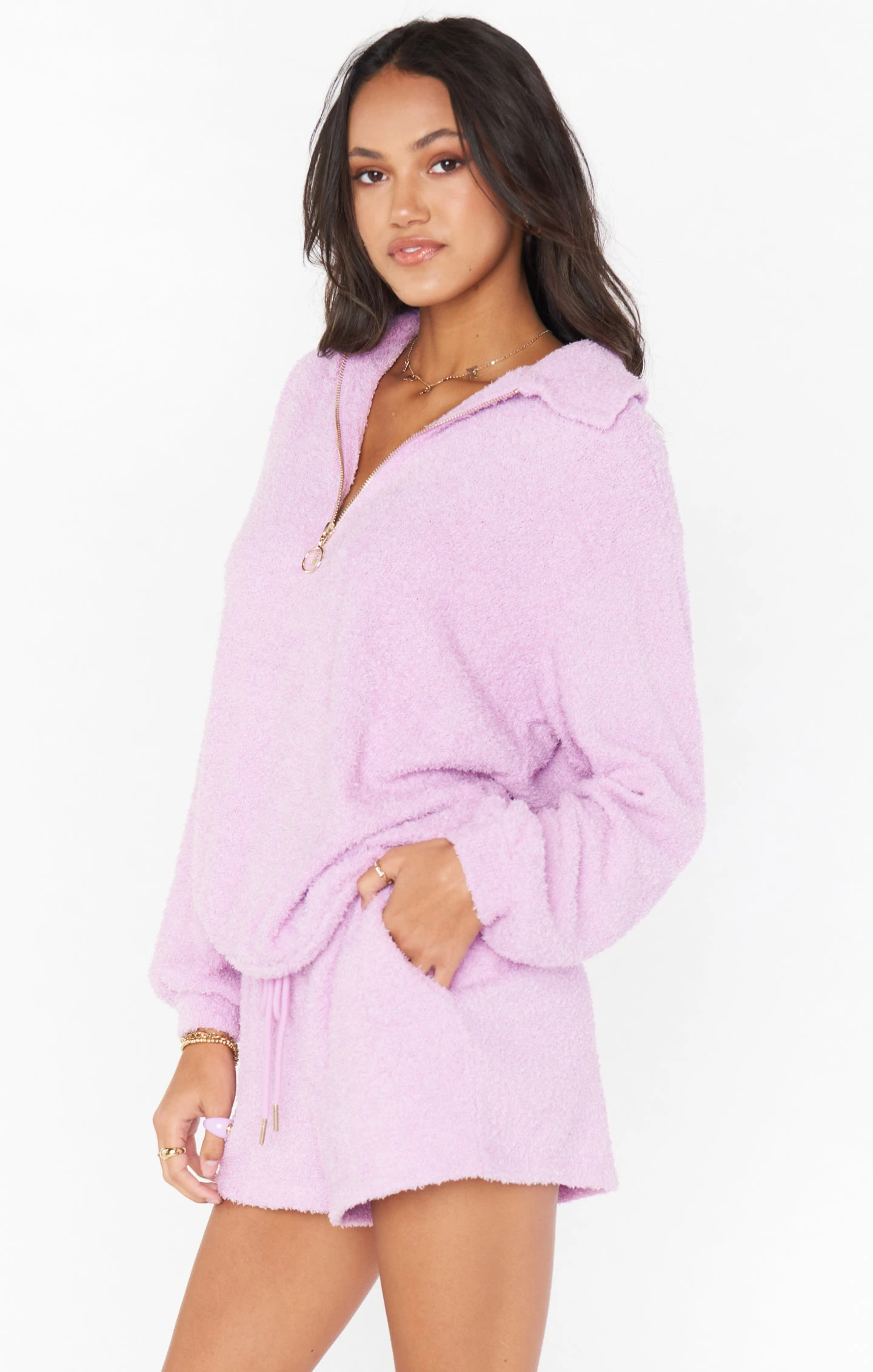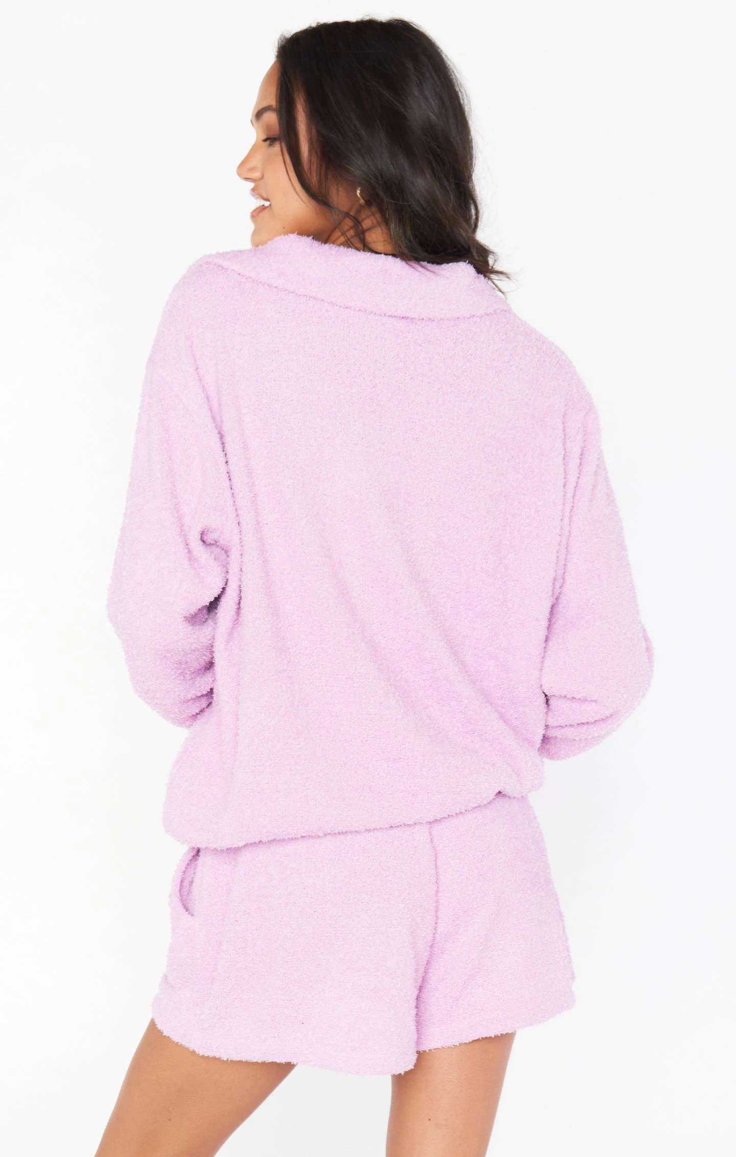 Terry and totally cute, this purple terry set is great for hanging around the house or the resort. Quarter zip with an o-ring zipper elevates the pullover, so its not your average lounge set!