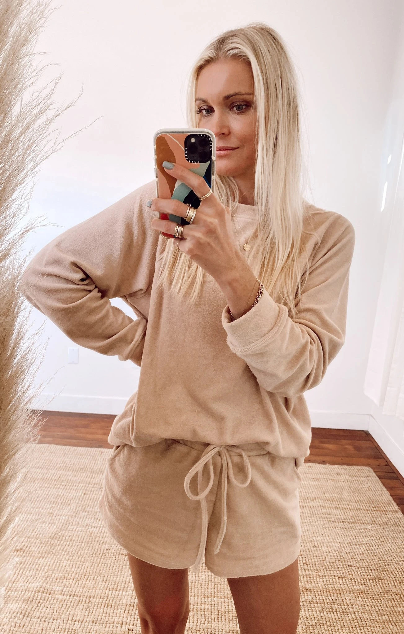 There is no better set than our new Sittin Around Set. Not only does she come in the perfect neutral, but her light weight and breathable terry fabric will keep you feeling cool and comfortable. You’ll be wanting to sit around all day long in this new cozy set!