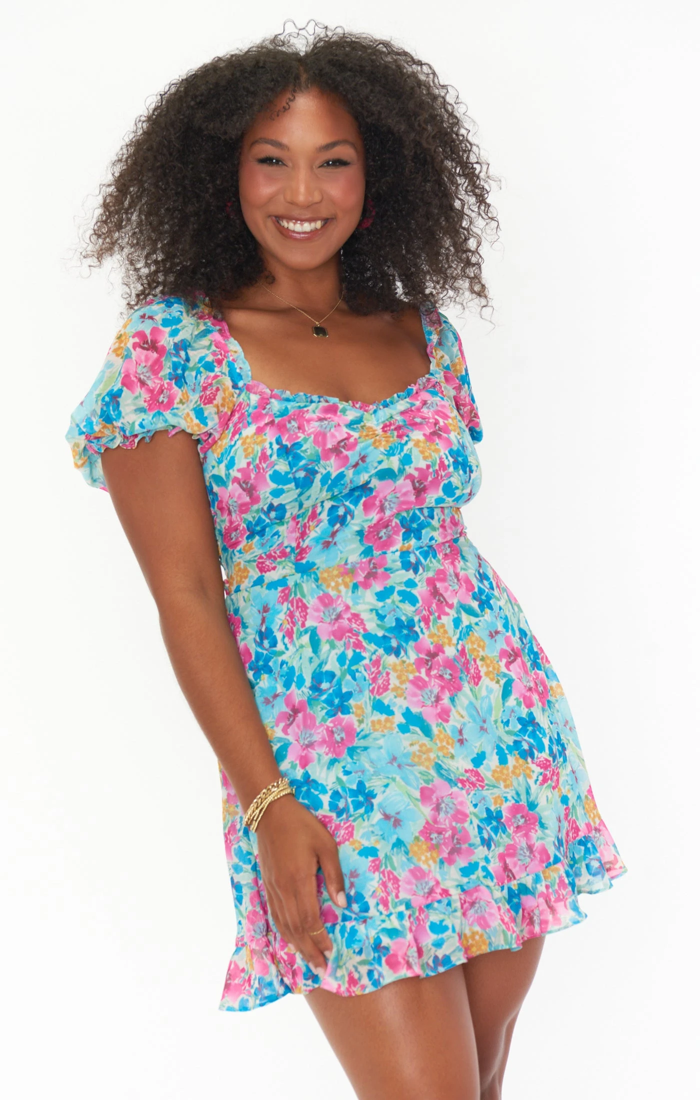 Tie your look together wearing the Tori Tie Back Dress decorated in lively florals with pops of pink, orange, and blue. A sweetheart neckline is paired with puff sleeves and a ruffled hem. The adjustable tie back gives this mini an added flirty feel that’s perfect for event season.
