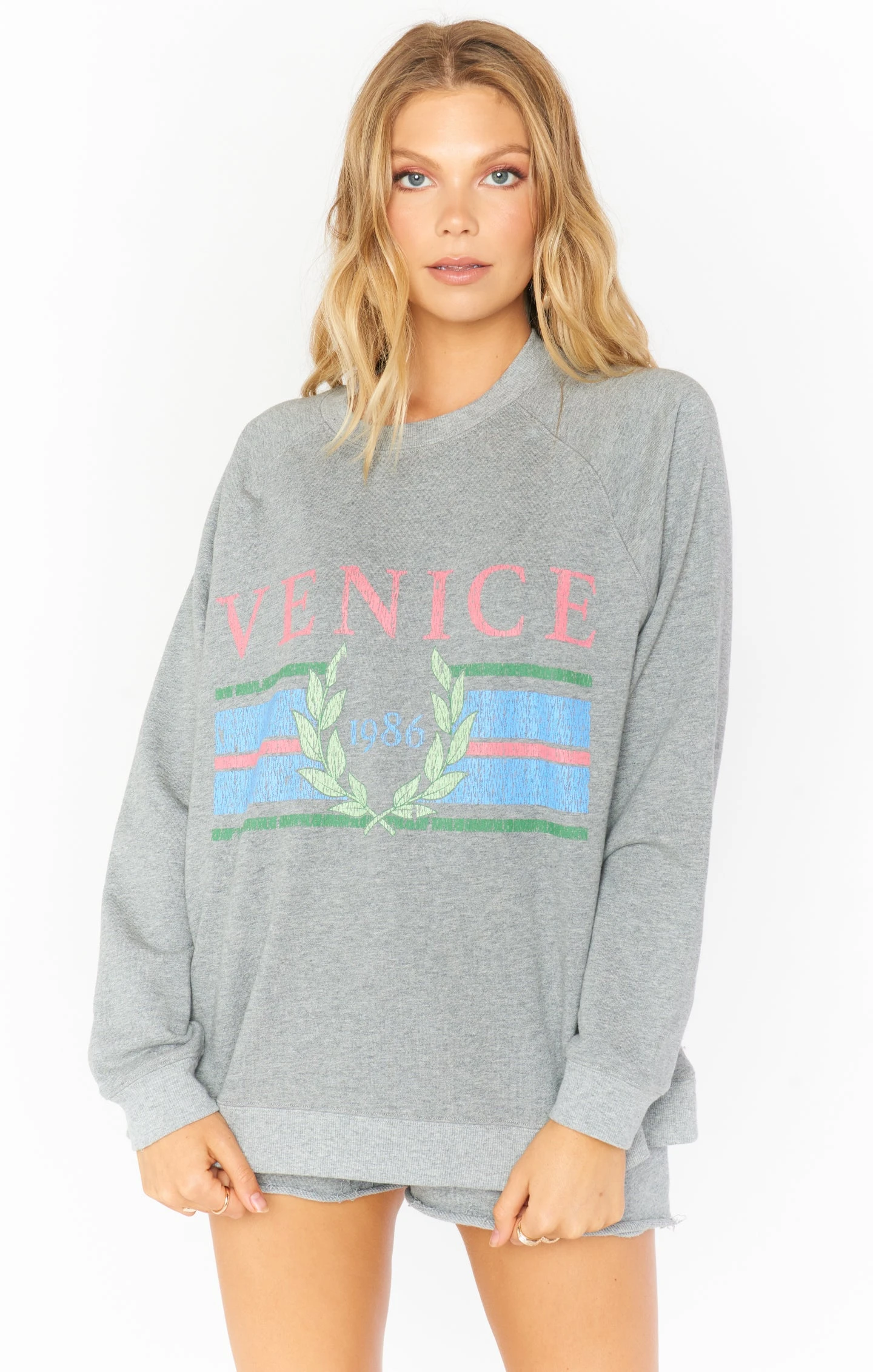 This heather grey sweat set is our best yet! A classic vintage insprired Venice grahic on the top has a perfectly slouchy fit on top of super comfy elastic waist shorts!