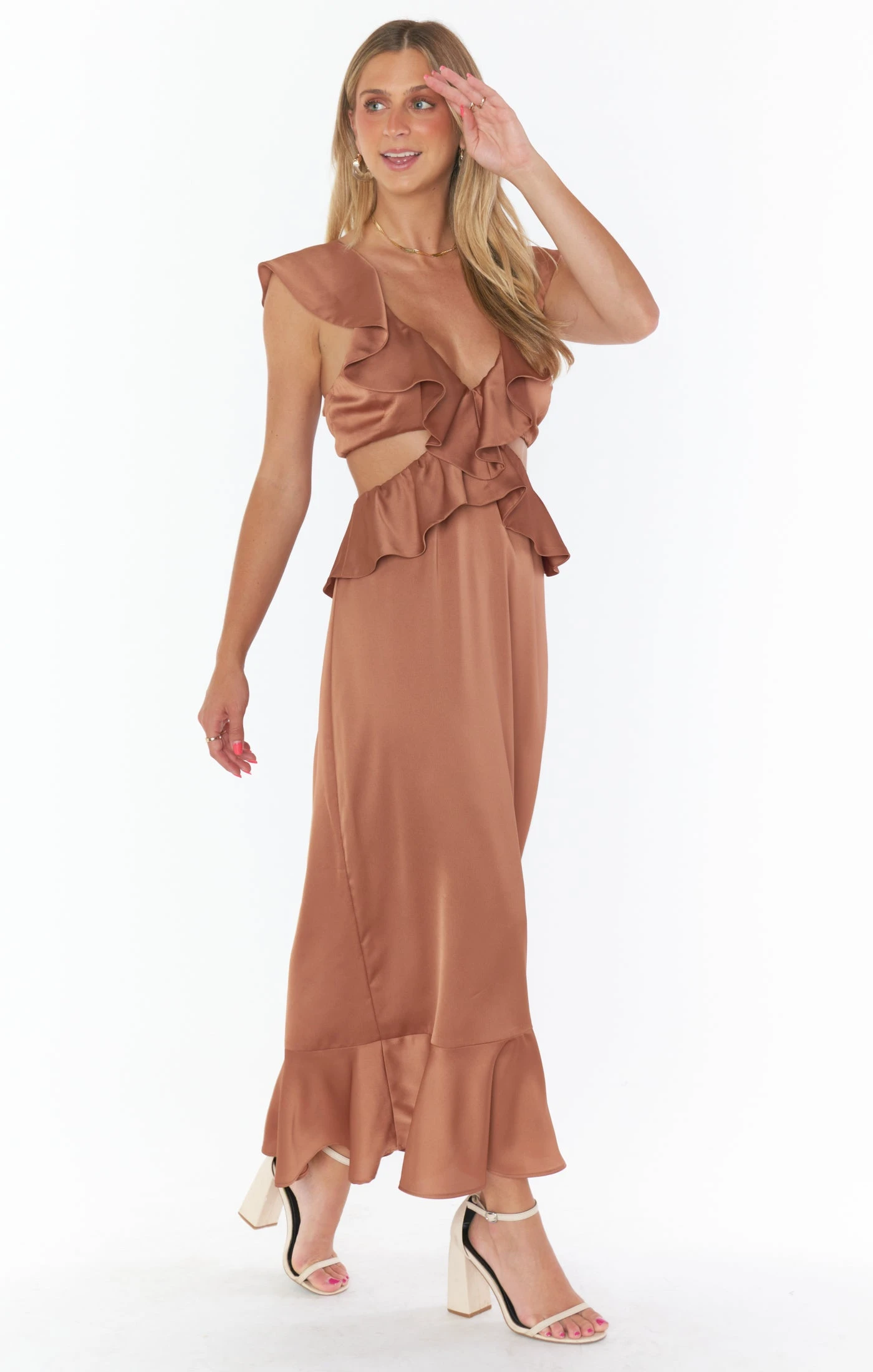 Show a bit of skin, but keep it classy in our Zoey Midi Dress. This chic midi has a crossed ruffled bodice with side cutouts that fall into an a-line skirt with a ruffled hem. Back elastic offers support for larger busts while a tie back allows a secure fit. Beyond chic for a bridal party and a new go-to for special occasions and events.