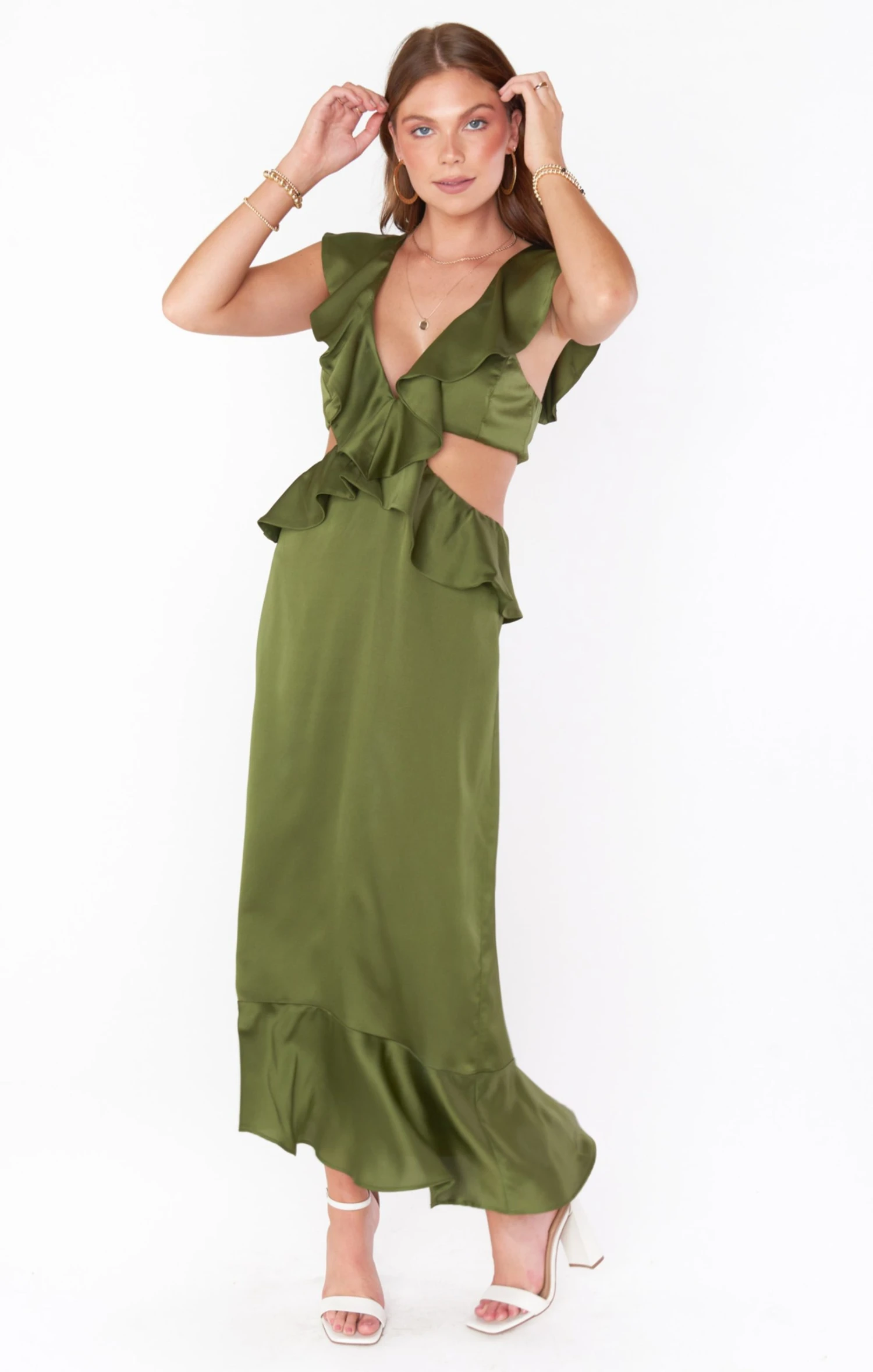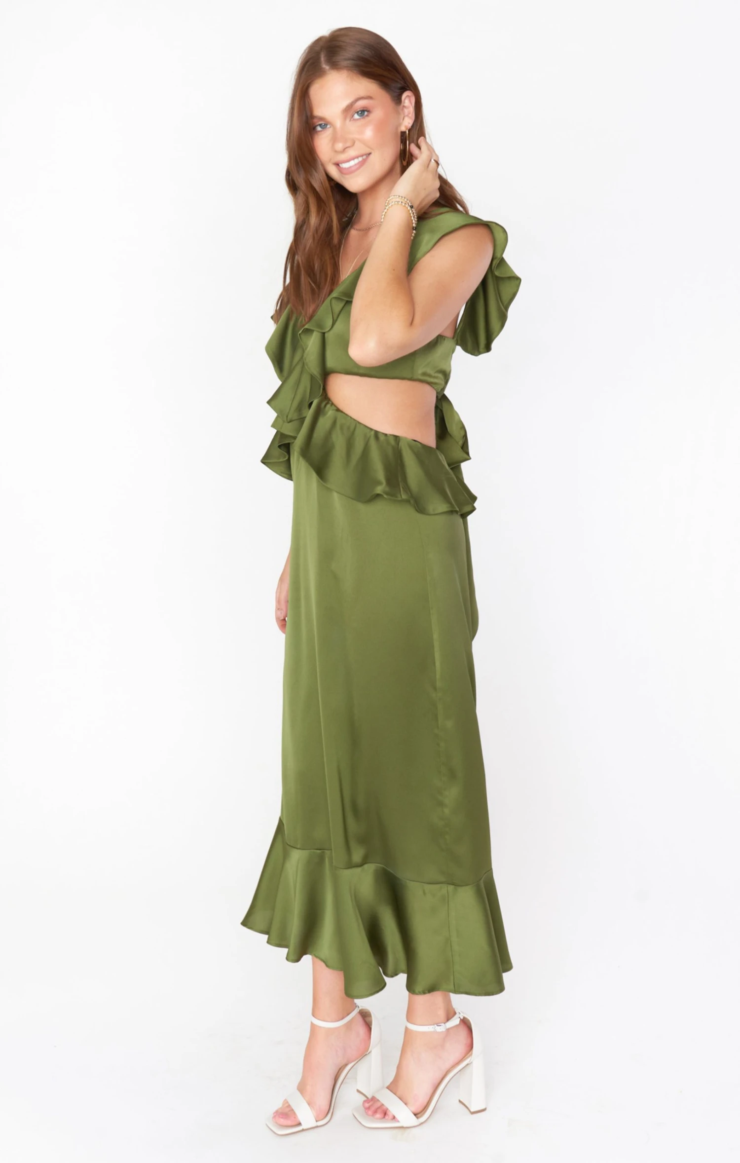 Show Me Your Mumu Zoey Midi Dress ~ Rich Olive Luxe Satin