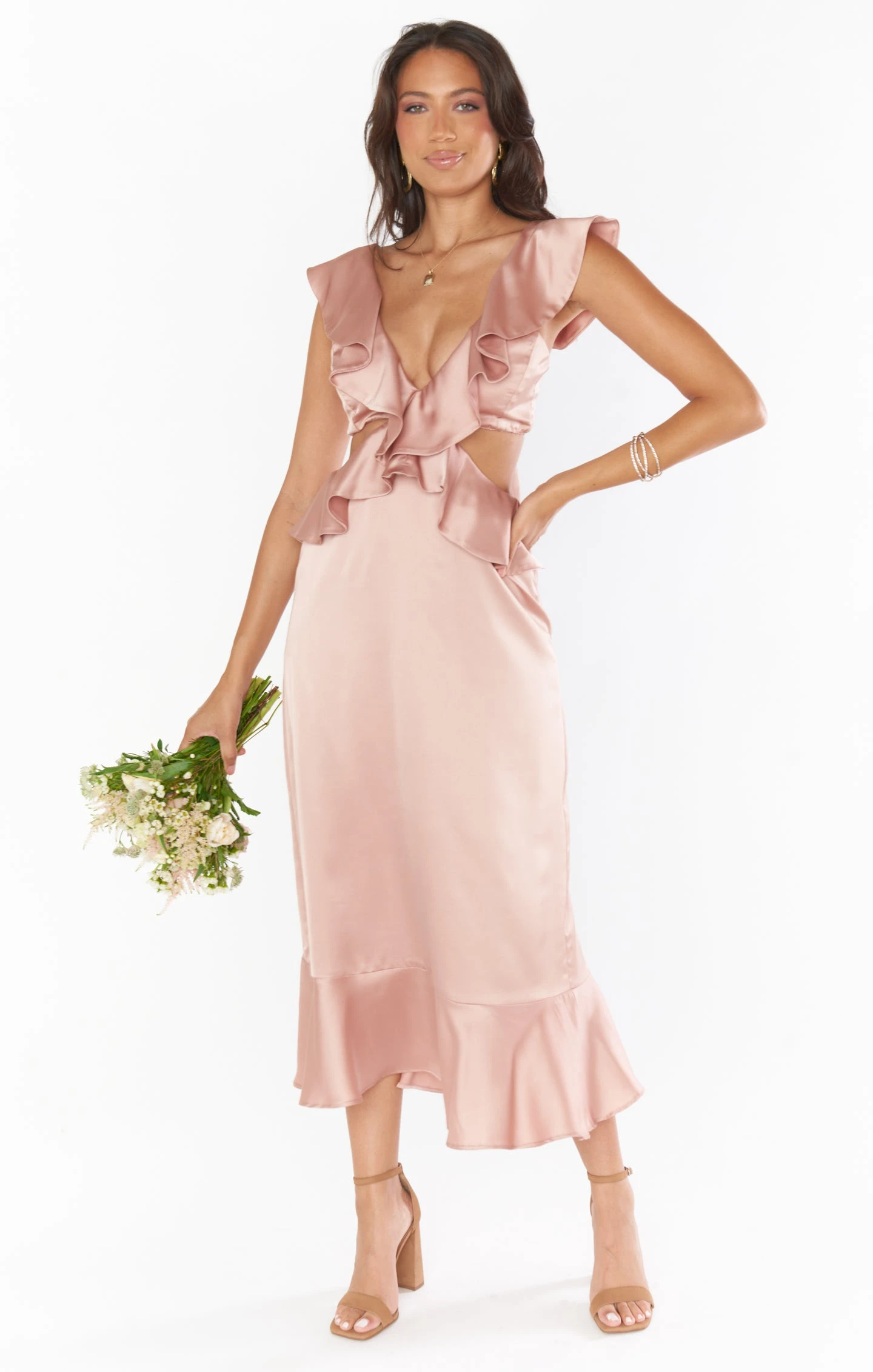 Show Me Your Mumu Zoey Midi Dress ~ Rose Gold Luxe Satin